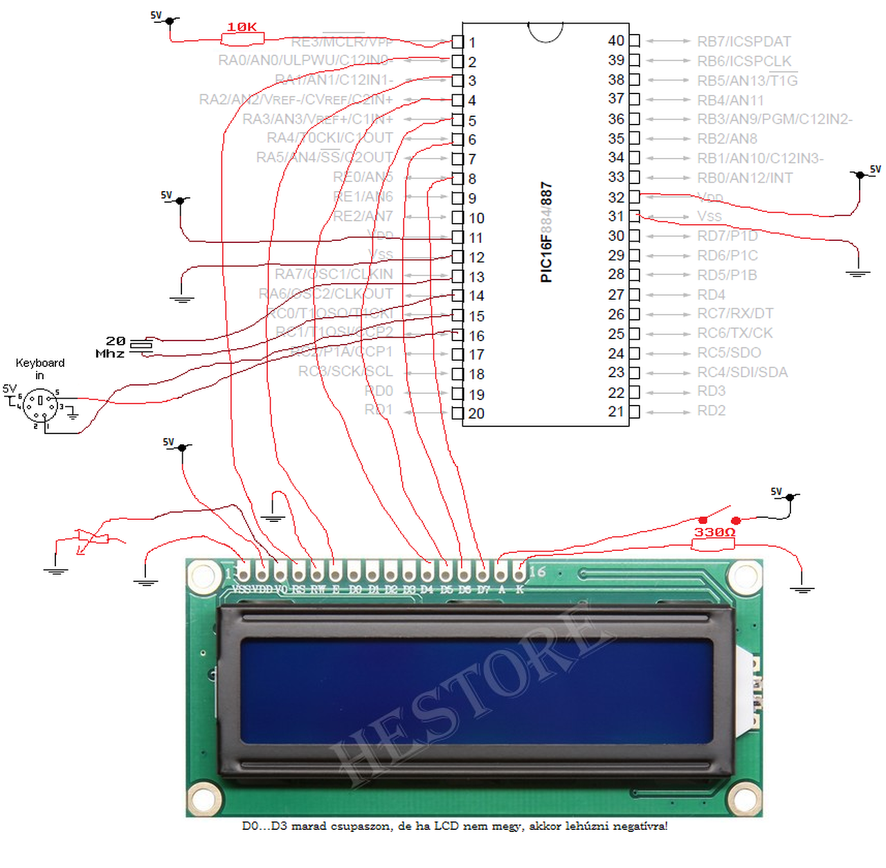 Mennyi a tápfeszültség a PIC-en, az LCD-n, polaritás jó-e, kvarc lábon van-e oszcilláció, milyen frekvencián, és mennyi az áramfelvétele az egésznek?