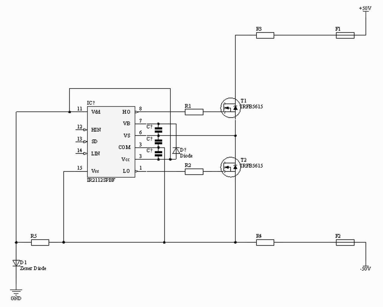 IRS2112 vel szeretnék megvalósítani MOSFET vezérlést. Átnézné nekem valaki az általam rajzolt kapcsolási rajzot, hogy a táplálást jól értelmeztem/kötöttem be? Nemszeretném elfüstölni őket. Másik dolog... A delay az fix 30ns? Nem lesz az kevés, vagy sok? Köszönöm!
