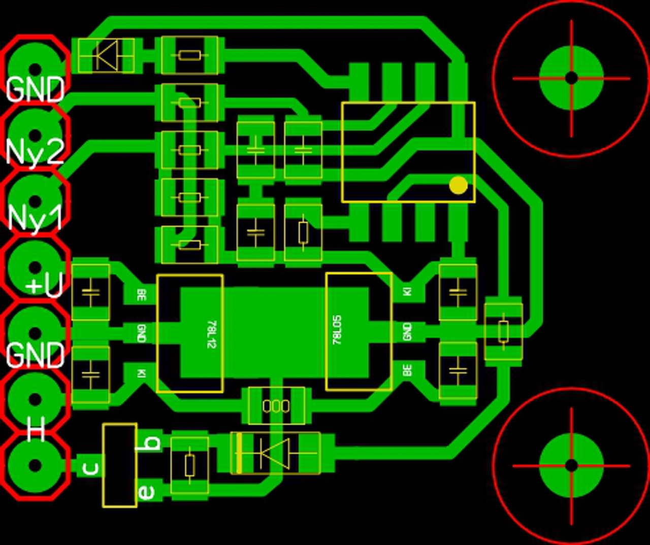 A baloldali képen az IC és a 10 µF-ok átkerültek a másik oldalra. De ott nincs rézréteg, nem lehet őket beforrasztani.