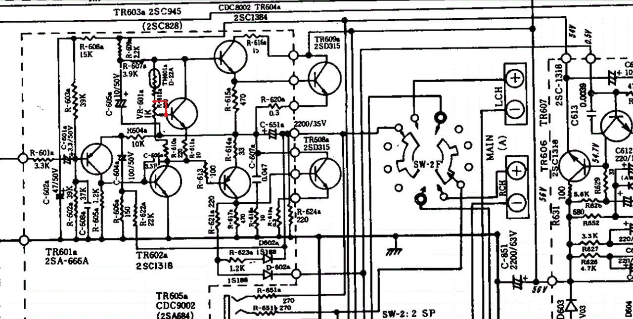 Egy Yamaha A520-ast javítok, amiben elhullott az egyik csatorna félvezetőinek java része (piros X a rajzon). Lehet, hogy itt is hasonló kapcsolástechnikai probléma áll fenn (nyugalmi áram beállító trimmer)?