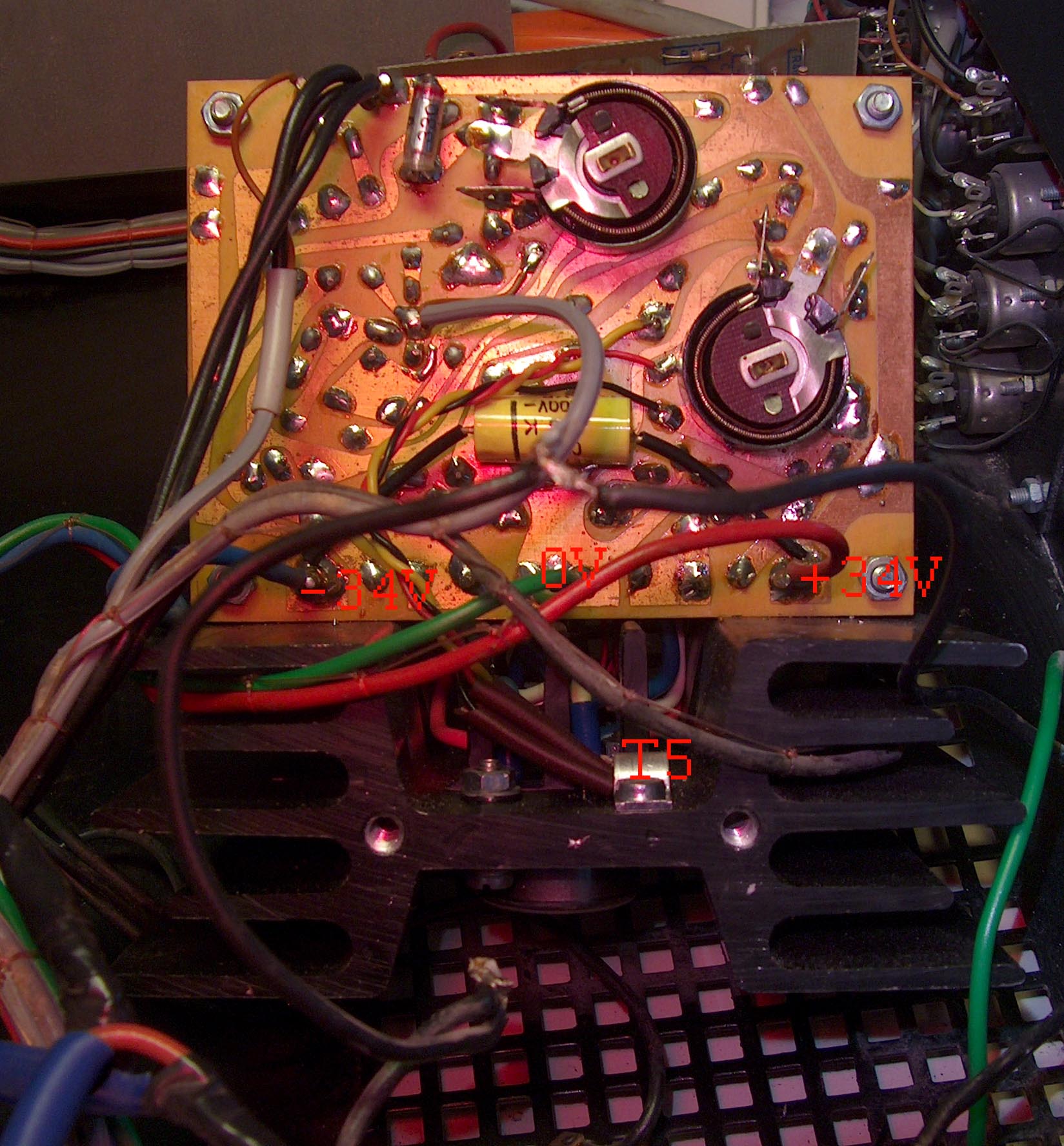 Ja és megvan a T5-ös is, csak rá van szerelve a bordára. (Bocsánat, hogy ilyen láma vagyok). Plusz ahova a 0V van írva, ott -34V van. Szóval valahol a 0V és a -34V között zárlatos valamelyik alkatrész? Vagy hülyeségeket beszélek? Csak tippelek.