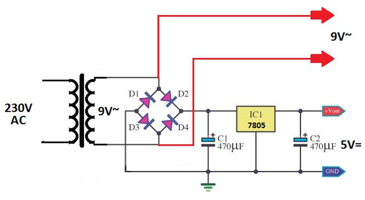 Szeretném megkérdezni, hogy mennyire szabályos a melléklet szerinti kettős tápegység kialakítása? Amire szükség van az 9V AC és 5V egyen feszültség. Mindkét "ágban" max 1A terhelés lenne. Ha jó a kialakítás, akkor egy 9V 20VA-es trafó elég a feladatra? Köszönöm!