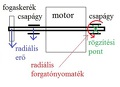 Tehát mindegy, mekkora a vonat tömege! Sőt, amikor a vonat nem gyorsul tovább, akkor a motor pontosan a veszteségi erőknek megfelelő erőt fogja kifejteni. Hogy ez a sebesség mekkora, az a veszteségektől és a motor erejétől (itt forgatónyomatékként jelentkezik) függ. Ha nem lenne súrlódás, akkor végtelenségig gyorsulna. Tehát a motortengelyre oldalirányú húzóerőként nem a vonat tonnái hatnak, hanem csupán a motor saját forgatónyomatéka, ami eloszlik aztán a tömeg gyorsítása és a legyőzendő súrlódás között. Amint ez a gyorsítóerő egyenlővé válik a veszteségekkel, a vonat nem gyorsul tovább. De ekkor is a motorra a sebesség fenntartásához szükséges húzóerő hat, ami a motortól függ. Ha a motorra nagyobb teljesítményt adunk, akkor ez az erő nagyobb, ha kevesebbet, kisebb. De nem függ a mozgatott tömeg nagyságától! A panaszolt esetben az a probléma, hogy ez a motorerő eredője a motorra, mint radiális húzóerő is hatott (mindig hat ilyen, eredőként, vektorosan számolandó), hiszen a rendszer szempontjából mindegy, hogy a láncot húzza a motor, vagy a lánc áll és a motor halad rajta végig, mint egy fogaskerekű jármű. Ezt az oldalirányú terhelést nem bírta a csapágy. Tehát abban neked igazad van, hogy rosszul oldották meg a kihajtást és nem egy kétoldalt csapágyazott tengely csapágyain osztották el ezt az erőt, hanem direktben a motor csapágyát terhelték vele. Sonajkniz kollegának meg abban van igaza, hogy elég gyengus konstrukció ez a motor, ergo, nem ilyen kihajtáshoz van kitalálva.