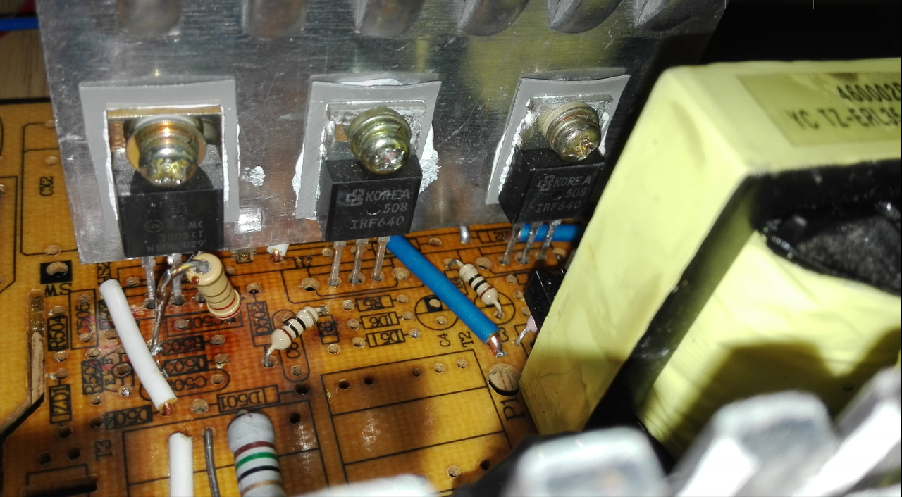 Nem tudni hogy üresen mekkora áramfelvétel van, mert ugye a 680mA-ba belemérted a ventilátort is, de az üresen kb. a duplája az elvárhatónak egy ilyen összeállításban. Az IRF640 pedig kicsit sem ide való, de erről is írtam már.