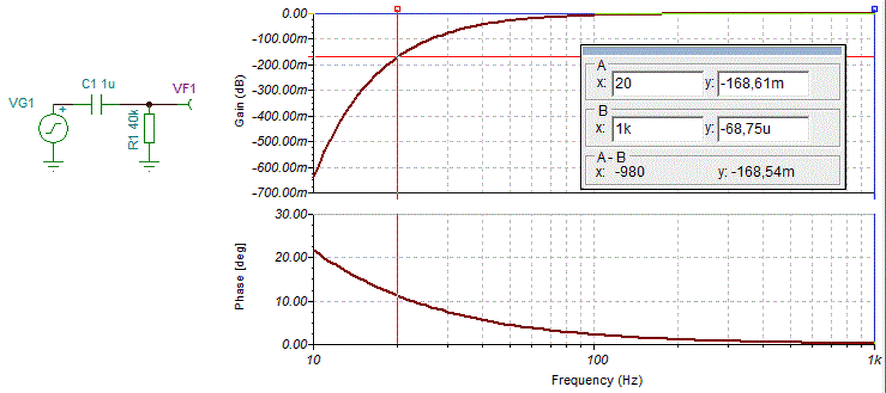 A 20Hz-es átvitel szempontjából nincs baj az 1µF csatolókondenzátorral. Mellékelek egy szimulációt az 1kHz és a 20Hz közötti csillapításról. Az eredményül kapott -0,168dB mindössze harmada annak a 0,5dB-nek amit egészséges emberi fül egyáltalán meg tud különböztetni.
