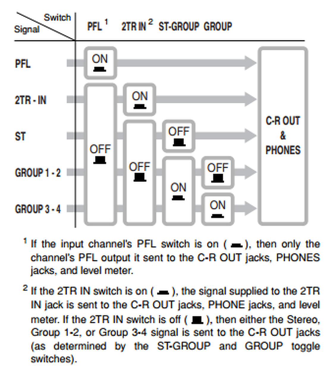 A Group-ok feletti "To ST" gombok végülis csoport némítások, ha ki vannak kapcsolva, az a csoport nem küld jelet a fő mixbe, csak a keverő hátulján levő Group kimenetekre, bekapcsolva küld.