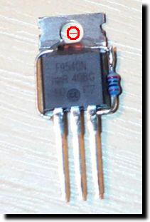 A DC-ék mind két fet surse lábára csatlakozik. A sorkapocs feliratozása elég közel van a fetek forr szeméhez, esetleg úgy tünhet hogy az 540 gate lábát jelölné a "-" jel, de a vezető sáv jól kivehető.