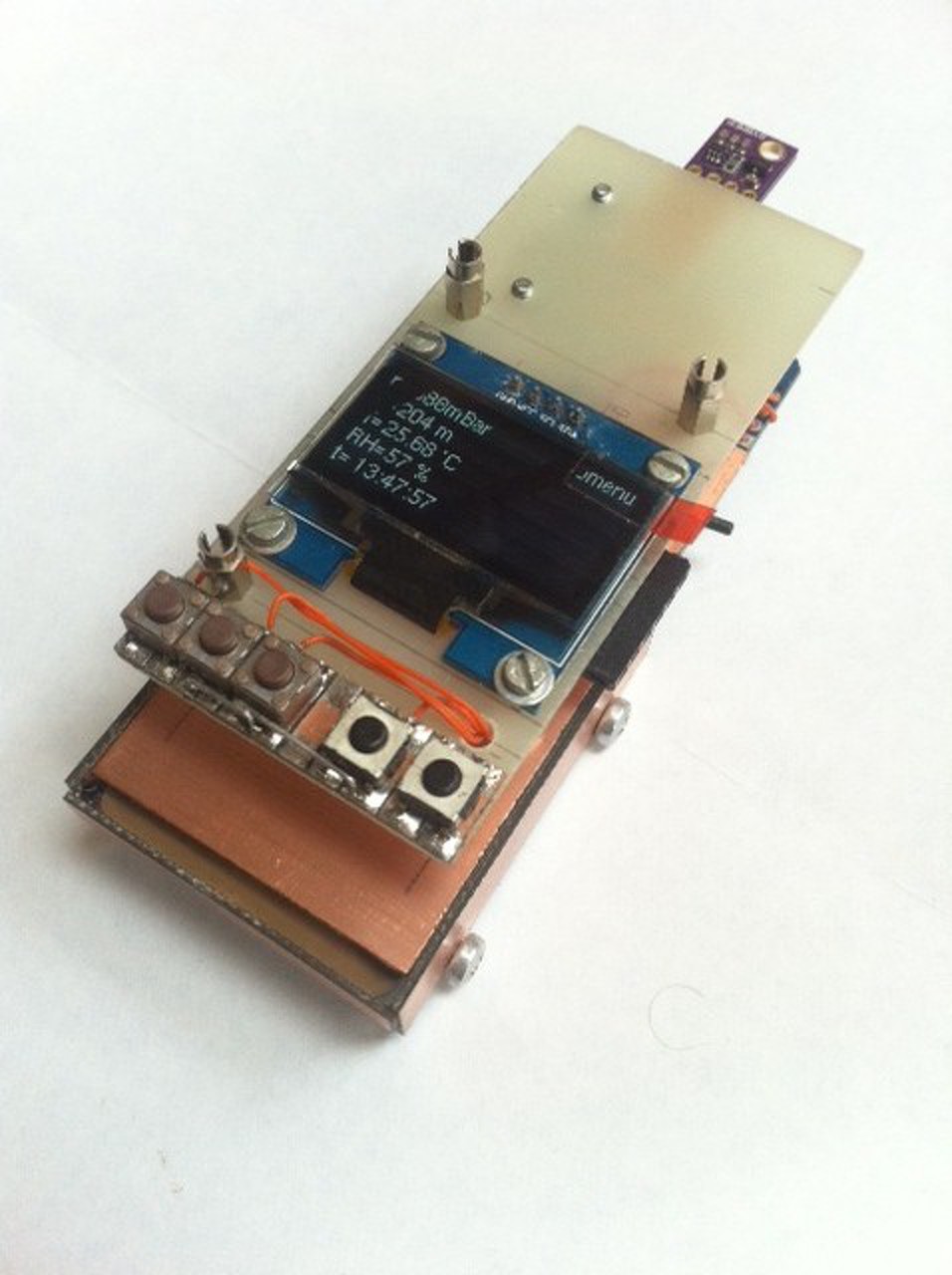 Szép napot! Magasságmérő ismét korszerűsítve. A továbbfejlesztett BME280-as szenzorral készült, beleépült a nyomás és a hőmérséklet szenzoron kívül egy légnedvesség érzékelő is. Összehasonlítva egy drága műszerrel, nedvességre ugyanannyit mutatott, hőmérsékletben késett fél fokot, ez az adatlapja szerint a tűrésmező széle, hát olcsó is volt. A szokásos OLED kijelzőn látható a légnyomás, az ebből számolt magasság, a hőmérséklet (indokolatlan pontossággal), a levegő nedvessége, és mivel terveztem adatgyűjtést is, a helyi óra által mutatott idő is. Az adatgyűjtés SD kártyára történt volna, de ezen hardver kezeléséhez szükséges szoftver már nem fért bele a tárba, igy ezt elhagytam. Helyette a légnyomást ábrázoltam analóg módon, egy stilizált mutatós műszerrel. Az eszközt, egy telefonakku táplálja 3.2-4.2V-tal, szerencsére az összes hardver működőképes ebben a feszültségtartományban. A fotón ugyan nem látszik, de a kijelző meghibásodott, a kigyújtott pixelek sorai halványan fénylenek, ki kell majd cserélni. De már megszoktam.