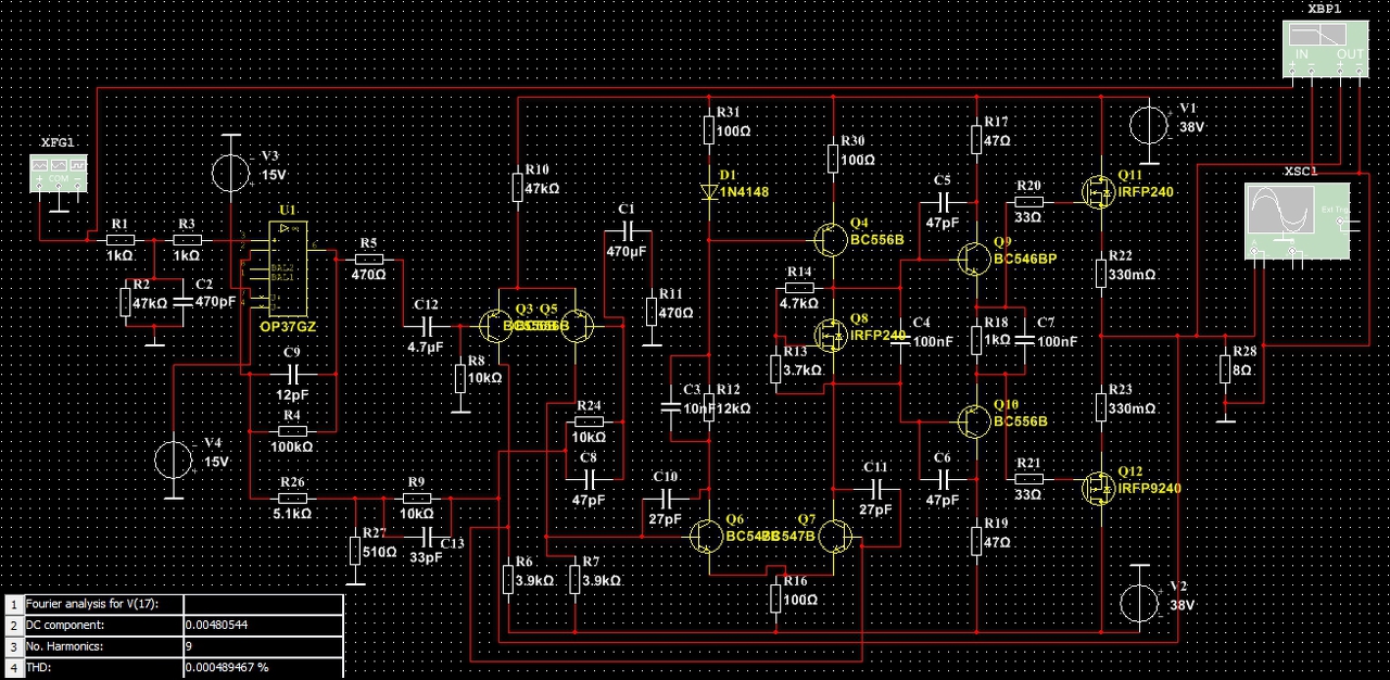 Így néz ki kicsiben, a torzítás ott van a bal alsó sarokban 85-90%-os kivezérlésnél. A teljesítmény sávszélesség 250-300kHz körül van, a valóságban ennek elvileg a duplája. Mivel nem találtam meg a rajzot így újra kellett rajzolnom, ezért hiányzik az áramgenerátor, meg fordítva van az egész, nem NPN hanem PNP tranyókkal indul mint a baji féle, de tulajdonképpen ugyanaz. Annak a 800W-osnak (AV800) a fetes meghajtása is elvileg jó lehet, meg kellene nézni szimulátorban. Szóval össze kell ollózni (méretezni) az adott teljesítményre, elé az OPA, áramkorlát bele, és elvileg lesz egy szuper végfokod.