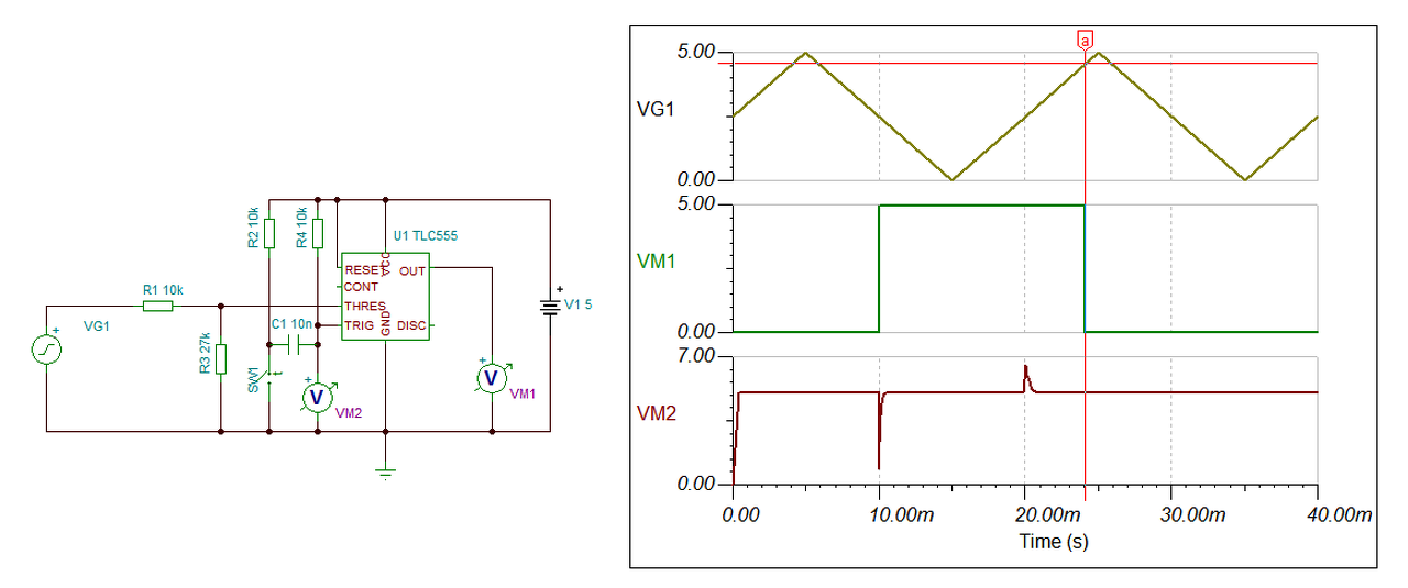 Amikor a komparátor bemenetét emlegetem, akkor magára a hiszterézis komparátorra gondolok és annak elengedhetetlen része az R6 és R7 tehát ekkor a bemenet alatt az R6-ra érkező feszültségre gondolok. Bocs ha nem voltam egyértelmű. Az 555-ös kapcsolást megnéztem alaposabban. A z R1 és R3-mal beállíthatom a komparálási szintet. A C1 értéke mi alapján lett 10nF ez csak ilyen saccolás? Nyilván kisebb értéket kell választani, mert a nagy kondi lassabban töltődik ami idő és amíg a kondi feszültsége az 1/3 tápfesz alatt van (és az SW1 be van kapcsolva) a védelem nem fog működni (már ha jól gondolom). Főleg, ha az SW1 be van kapcsolva a kondi töltődik 1/3 tápfesz alatt van a feszültsége ezalatt a kimenet magas szinten van, és tegyük fel, hogy a threshold-ra 2/3 tápfesznél nagyobb érkezik akkor mi a helyzet? Egyszerre van logikai 1 az S és R-en. Egyébként lehet jó lesz ez is, ha C1-et be lehet állítani, hogy 1usec-nél kisebb lesz az az idő amíg a kondi feszültsége 1/3 tápfesz alatt van resetelésnél. A másik amit nem találtam a sebességbeli adat, milyen gyorsan tud reagálni ha változik a thresholdra érkező feszültség. Rise és fall time 100ns, de response time? Vagy az elhanyagolhatóan kicsi? Idézet: „magára a hiszterézis komparátorra gondolok” Korábban kellett volna szólnom hogy ilyen nincs. Olyan van hogy hiszterézises bemenetű áramkör, de ez teljesül az R15 előtti pontra is. A reakcióidő ha nem is elhanyagolható, azért elég gyors, 100 ns nagyságrendű. Biztos hogy van ilyen gyors a védelmed többi eleme? ![]() Hogy egyidejű S és R bemenetre mit lép, az sajnos indefinit, a belső FET-ek csatornaellenállásaitól függ, de valószínű, hogy a megelőző állapotban marad. Igen, a 10 nF csak egy demonstratív érték a szimulációhoz, lehet csökkenteni.
