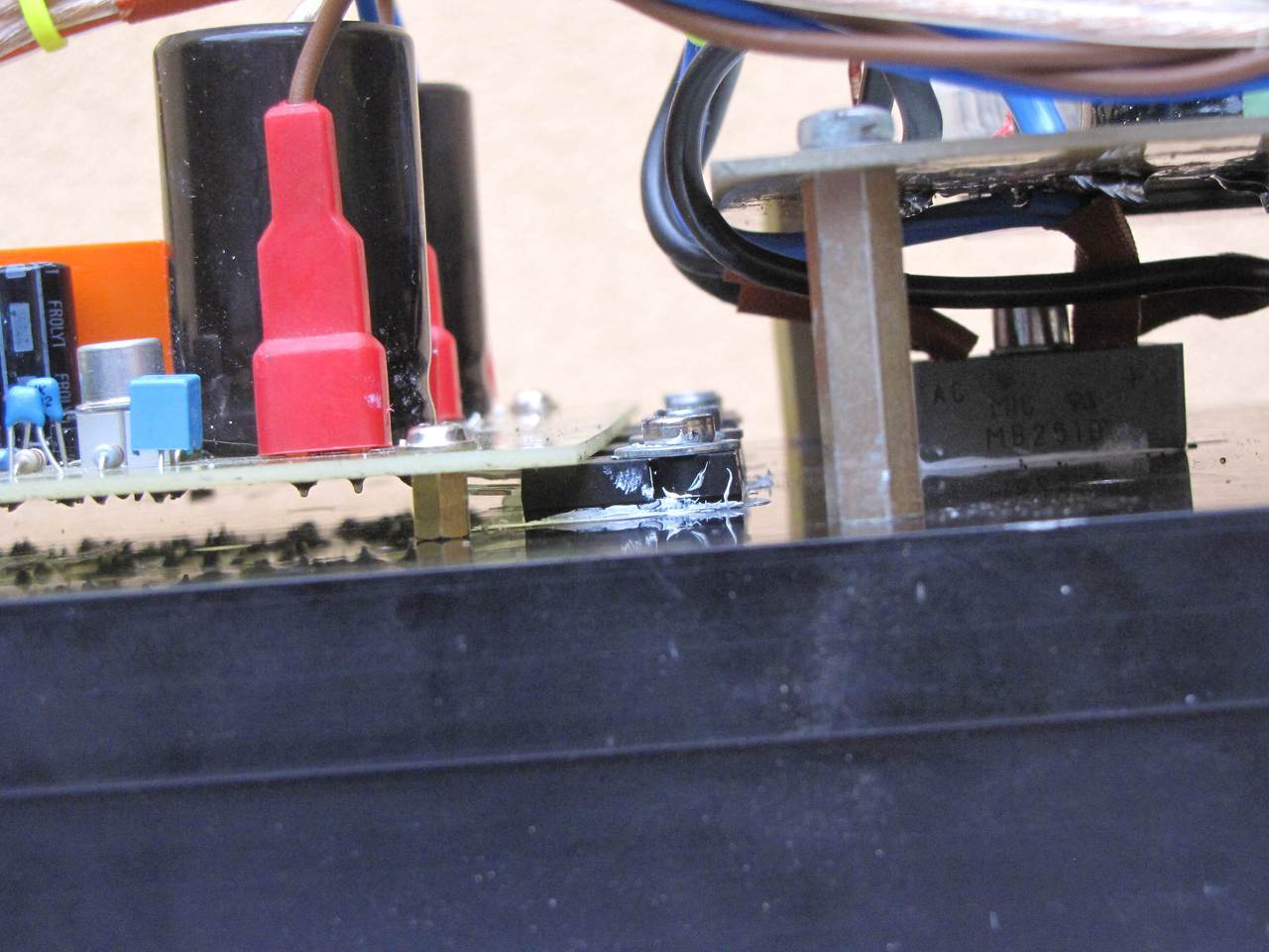 Folyt. Ugye hogy pont megfelelő a PC távtartó 8.jpg. Ha már ennél a képnél tartunk, szintén Alkotótól ollóztam a késes csati ötletet, meg rá a műanyag fedősapkát. Kár hogy csak piros volt. De randa az a Graetz ott alul. Látható, a kimeneti kondi 4700µF 63 Voltos, 9.jpg. A T1 es tranyó BC212 és ott hátrébb egy kisszéken üldögélve egy megfáradt BC211. Kissé melegszik a lelkem, de simán bírja. Valaki azt mondta, hogy A osztályú erősítőnél nincs kicsi hűtőborda. Ez a böhönc egy 15Kw os toroid lágyindítolyának elhalálozásából visszamaradt relikvia. Mellette egy 4dl es ásványvizes flakon, a méret végett. A borda képes 60C fokon tartani a négy forrófejű tranyót, és az őket etető egyenirányítót. A végfok 1,4 A nyugalmi áramra van beállítva 8 ohmon. A bordák 12 cm magasak. A borda alp 20 mm vastag. 10.jpg. A borda, és tartozékai felülről 11.jpg A kész, működő J.L.Hood 10W os végfoka, a panelre szerelt kimenőkondival. A kábelek kötegelőkkel lettek összefogva, a zárlatok elkerülése végett a késes csatlakozók védősapkával lettek ellátva. Felteszem a sprintlayout os állományt is, ha esetleg valaki meg szeretné építeni. A fotókon talán látni, a BC212 es tranyót fordítva kellett bekötni, mert benéztem a kapcsolást. A feltett .lay6 fileban már ez javítva lett. A megépíteni szándékozóknak azt tanácsolom, hogy a fórumon nagyon sok okosság található, nagyszerű szakemberektől. Ha ezeket megszívelitek, ez az erősítő gond nélkül fog indulni, ezt garantálom. Még egy megjegyzés: sokan javasolják, a kimenő kondival párhuzamba kötni egy 4-10 µF os MKT kapacot. Kipróbáltam én is, de kivettem, mert a magas hangok nagyon tolakodóak lettek. Viszont mivel a kapcsolás hangját a felhasznált félvezetők határozzák meg, kipróbálásuk mindenképpen indokolt. TIP35 esetén nekem nem jött be, ezért ki is vettem.