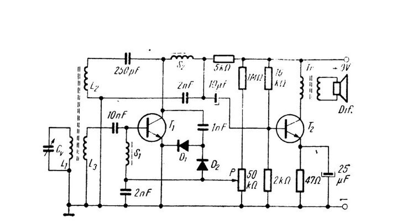 Aki nem akar reflexet épiteni annak itt van egy másik egyenes két tranzisztorral,és mert itt két RF fokozat van,mennek a közönséges szilicium diodák is detektornak,persze jobb a germánium,ezt a vevőt is lehet ferritrúd nélkül megépiteni és elég érzékeny,hogy menjen külsőantenna helyett egy darab dróttal,vagy autóantennával.
