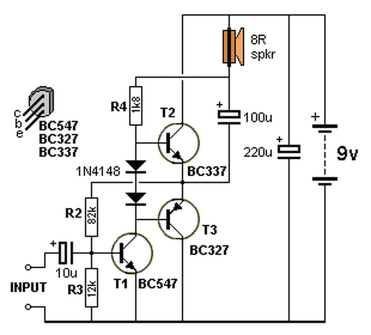 És még egy változat,itt is mehet a T2 helyett az ellenütemű erősitő,és mennek az npn sziliciumok is a polaritás megcserélsével,és a polarizáció beálitsával,persze meg kell forditani az elkókat is.