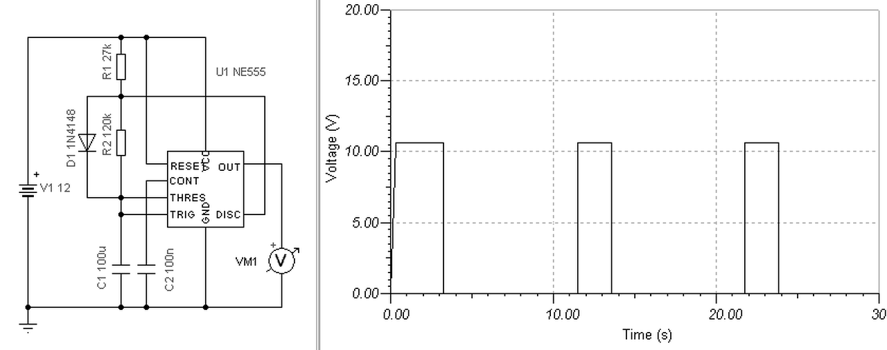 - Az IC1 egy astabil kapcsolás, ami egy lefutó rövid idejű trigger jelet állít elő IC2 számára. A frekvenciája a 22kohm-os potival állítható. - Az IC2 egy monostabil multi. A 2-es lábra érkező trigger jel hatására a kimenete magas szintre vált. A C3*(R15+Poti) idejétől függően visszavált alacsony szintre. Újbóli impulzust ismét a trigger jel váltja ki. - Az IC3 kapcsolása szerintem hibás, a cél gondolom az lett volna, hogy az impulzusok csak 0,5sec ideig tartsanak. (De pld. a 6-os láb nem lóghat a levegőben..)