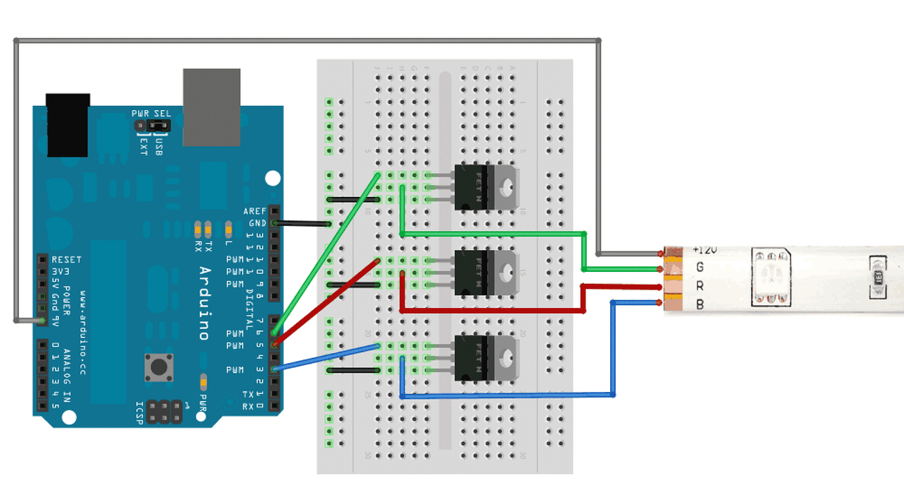 A párhuzamos az azért kell, hogy vezérlés nélkül ( mikor pl. indul a program ) a FET ne nyisson ki, a soros pedig korlátozza az áramot. Azért kell korlátozni az áramot, mert a FET bekapcsolásakor a Gate töltetlen, ezért egy pillanatra rövidzárként viselkedik ( ill. kikapcsolásnál az ARDUINO viselkedik közel rövidzárként, amire "rásütöd" a Gate-ben felhalmozott töltést !) !