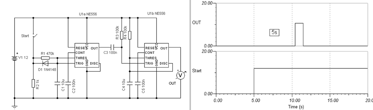 Olyat szeretnék hogy egy555 ic bekapcsoláskor 5 másodpercet vár azután 5 másodpercre bekapcsol ezután újra ki és kikapcsolva marad a következő bekapcsolásig.