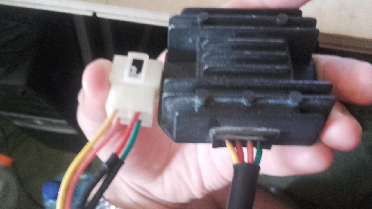 Ha a motorod generátorából 3 vezeték érkezik, akkor nagy valószínűséggel a zöld, narancs és sárga vezetékekkel kell találkozniuk. A sorrend tetszőleges. A fém ház a negatív (motor váza) a piros az akku pozitívja. De egy multiméterrel könnyen leellenőrízheted. Vagy akár egy elemmel és egy izzóval is. Ha pozitívot kötsz a zöld, narancs, és sárga vezetékekre, (külön-külön), akkor a piros vezetéken, ha negatívot, akkor pedig a fém házon kell záródnia az áramkörnek. Ezek a fajta fesszabályzók úgy működnek, hogy elvégzik az egyenirányítást, a többlet energiát pedig egyszerűen elfűtik.