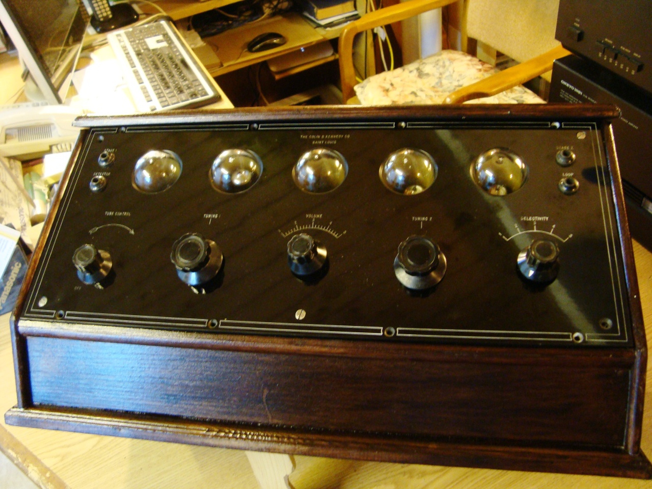 Ha én épitettem volna me,akkor biztos tranyókkal csináltam volna URH-ra,hogy valamit azon a süket Kossuthon kivűl még lehessen venni vele és az üveg burák alá tettem volna ledeket,vagy skálaizzókat,hogy világitsank mint valami cső,az antik benyomás igy is meg van,főleg ha van egy tölcséres hangszóró.
