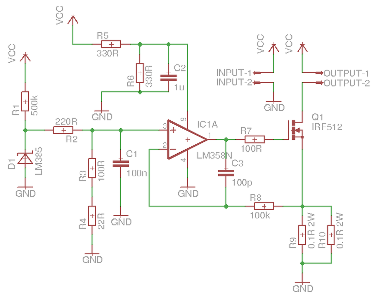 0,05 Ohm * 3 A = 0,15 V Az LM185-nek ugyan elég 10 uA, de a feszültségosztót is táplálni kellene valamiből. Sokkal nagyobb ellenállások kellenének a feszosztóba. Az IRF530 az esetleges zárlat esetén disszipálódó 3 A * 24 V = 72 W-ot nem fogja sokáig bírni. Egy tipp: Ha a referencia feszt adó IC tápáramának döntő részét a kimenetről vennéd, megoldható lenne visszahajló áramkorlát, zárlatban töredék árammal.