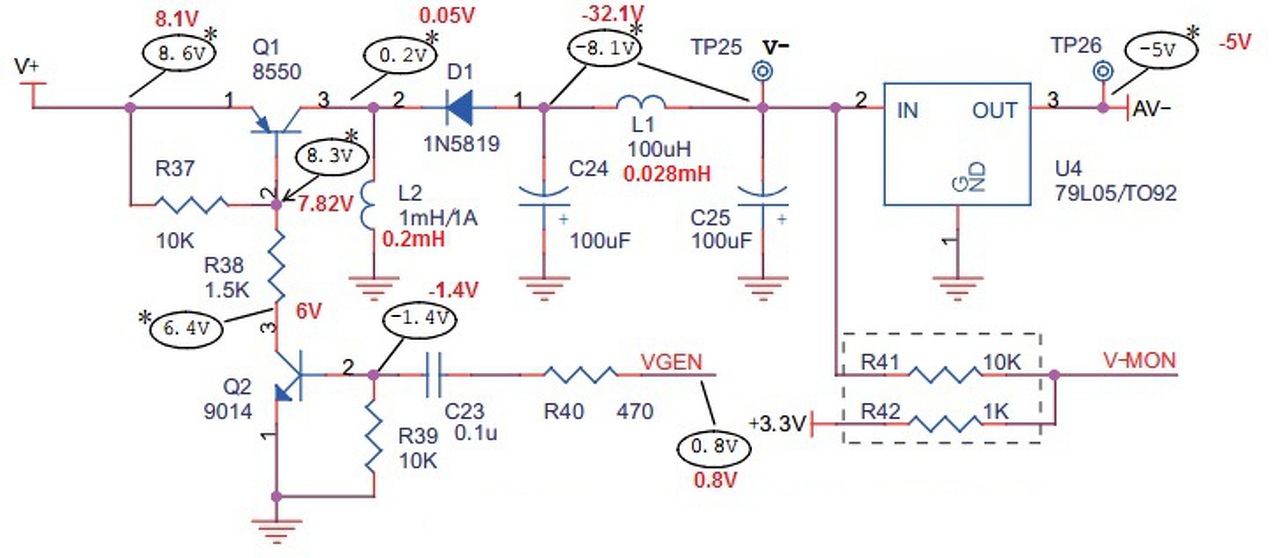 Van az alábbi kapcsolás (Kép) Hogyan lehet -32.1V, ott ahol -8,1V-nak kellene lennie? Piros színnel a mérési eredmények láthatóak.
