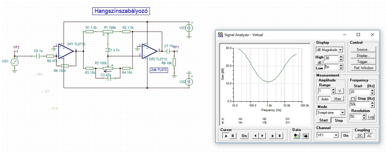 Olyan fájlt csatolj amit meg is lehet nyitni. Itt van egy ami működik, itt is meg megépítve is. A jelanalízist ha bekapcsolod látni fogod az átvitelt a potik állásának függvényében, ahogy a képen is van.