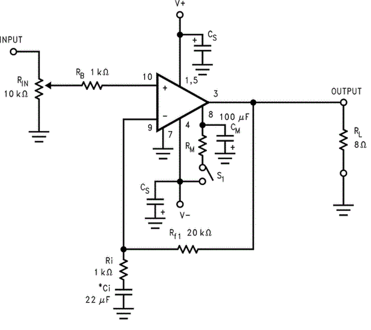 Az IC-t beírva a gugliba máris nyilvánvalóvá kellene válni, hogy hiányzik. Esetedben azt ajánlom, a bementi pontot kösd egy 100 k értékű ellenállással a testre. Az érték abból származik, hogy a 3-9 lábak közötti visszacsatolás ilyen értékű, ettől várható a legkisebb kimeneti egyenfeszültség a kiegyenlítettség miatt. A bemenet elé 220-470 nF értékű csatolókondenzátort ajánlok.