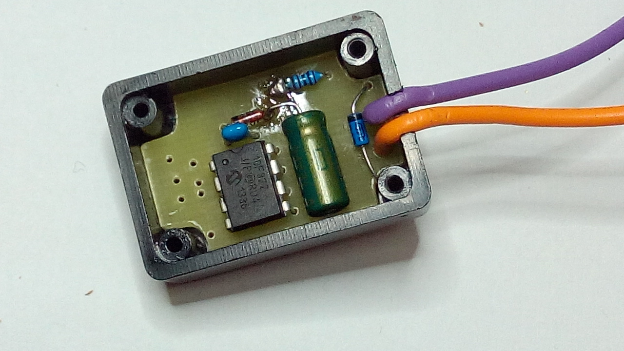 Fiam irányjelzőt szeretne rakni a 32 éves HONDA MB 50-es motorjára. A kormánykapcsoló elő is van erre készítve. A gond csak az, hogy a gyári indexrelék működéséhez kell az akkumulátor. Lévén az nélkül erősen inog a feszültség a fordulat függvényében, amit az indexrelék nem szeretnek. Ezért készítettem el a képeken látható egyszerű áramkört. Az alapja egy PIC10F322 mikrokontroller. Csupán sorosan kell kötni az izzókkal úgy, hogy a pozitív táp az izzón, a negatív pedig a lila vezetéken legyen. Nem okoz problémát az elektronika számára sem a lüktető egyenáram, sem az ingadozó feszültség. Ráadásul az terhelés 2-60W-ig bármekkora lehet. Stabilan tartja a 90 villanás/percet. Mindössze 30W felett hűtést igényel. A 4. képen látható, hogy még dobozolva is elég kicsi, ezért bárhol könnyű neki helyet találni. Egy kis videó működés közben.