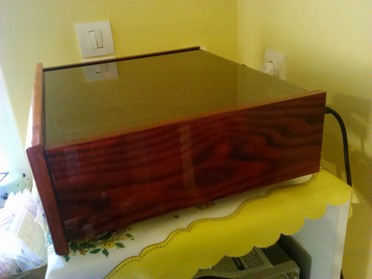 Jól néz ki, de hogy fogod lezárni (érdekel a végső megoldás)? A nyáklap nem rossz doboznak, de a szervizelhetőség sem megvetendő. Én inkább valami élprofilt használtam volna a nyáklapokhoz és csavarozható megoldást.