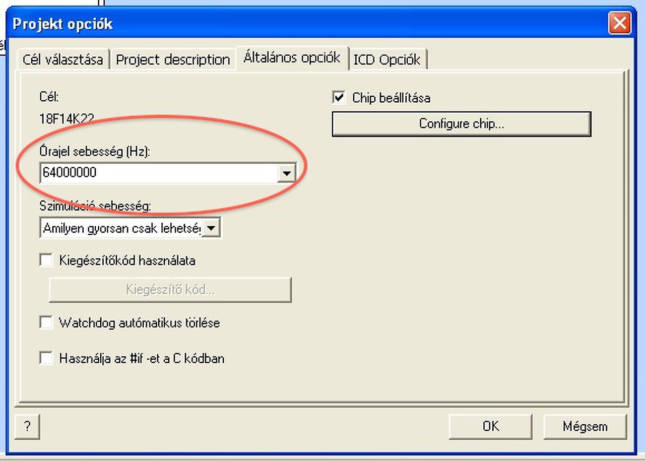 Általánosságban elmondható, hogy 8 - 16 MHz elég szokott lenni. Mellékletben két példa a beállításokról. Ha a C blokkból kiválasztod a neked szimpatikus sebességet, azt a Chip beállításaiban is meg kell adni, mert a kontroller igazábol nem tudja, hogy mekkora frekvenciájú órajelet kap. A beállításokkal csak a belső oszcillátort vezérled. Flowcode fájl elérési útvonalában és a fájl nevében ne legyen speciális karakter, a fordító elhasal rajta.