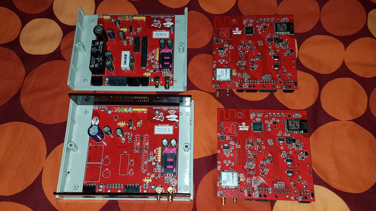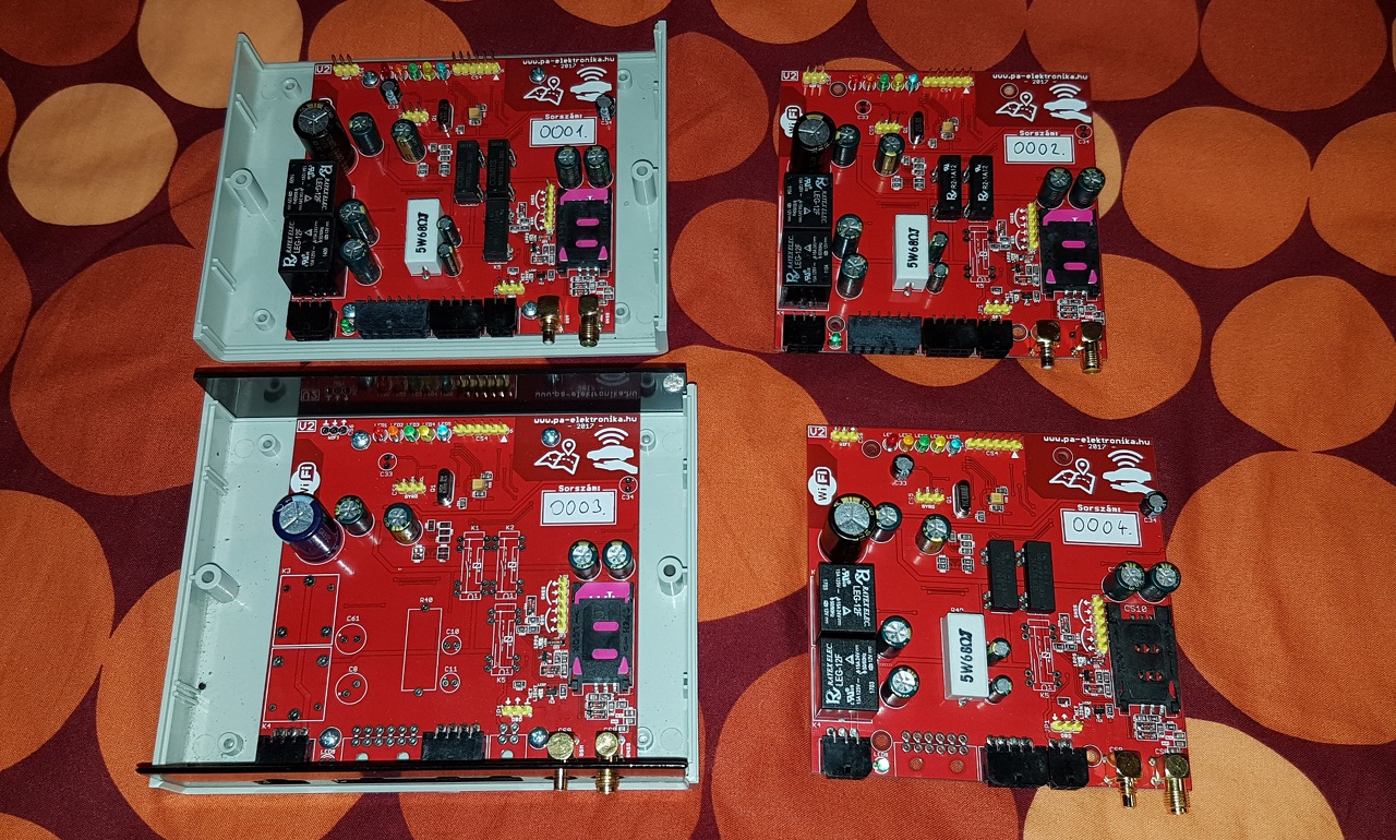 Beültettem a negyedik immobilizer/nyomkövető elektronikát, az első hármat pedig visszarendeltem szoftverfrissítésre és némi hardveres bővítésre. Így kivételesen egy fotón tud szerepelni az összes: