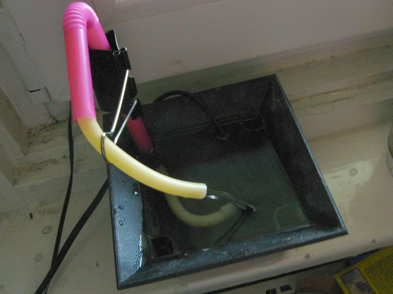 Eredetileg (gyárilag) volt ennek egy lépcsőzetes teteje, aminek a közepéből jött a víz a tetején lévő kőgolyó alatt és amolyan dekoráció szerepe volt. Tulajdonképpen most csak valami tényleg nagyon halk csurgás hangja van, ahogy a folyamatos vízsugár bele érezik a vízbe. Tényleg alig hallani. A fotó óta betettem éknek egy fél ruhacsipeszt a vastag szívószál mellé az iratcsipeszbe, hogy az ne csússzon le. Hogy mi célt szolgál? Ööö... Izé... Pontosan én se tudom, csak megcsináltam, mert miért ne?