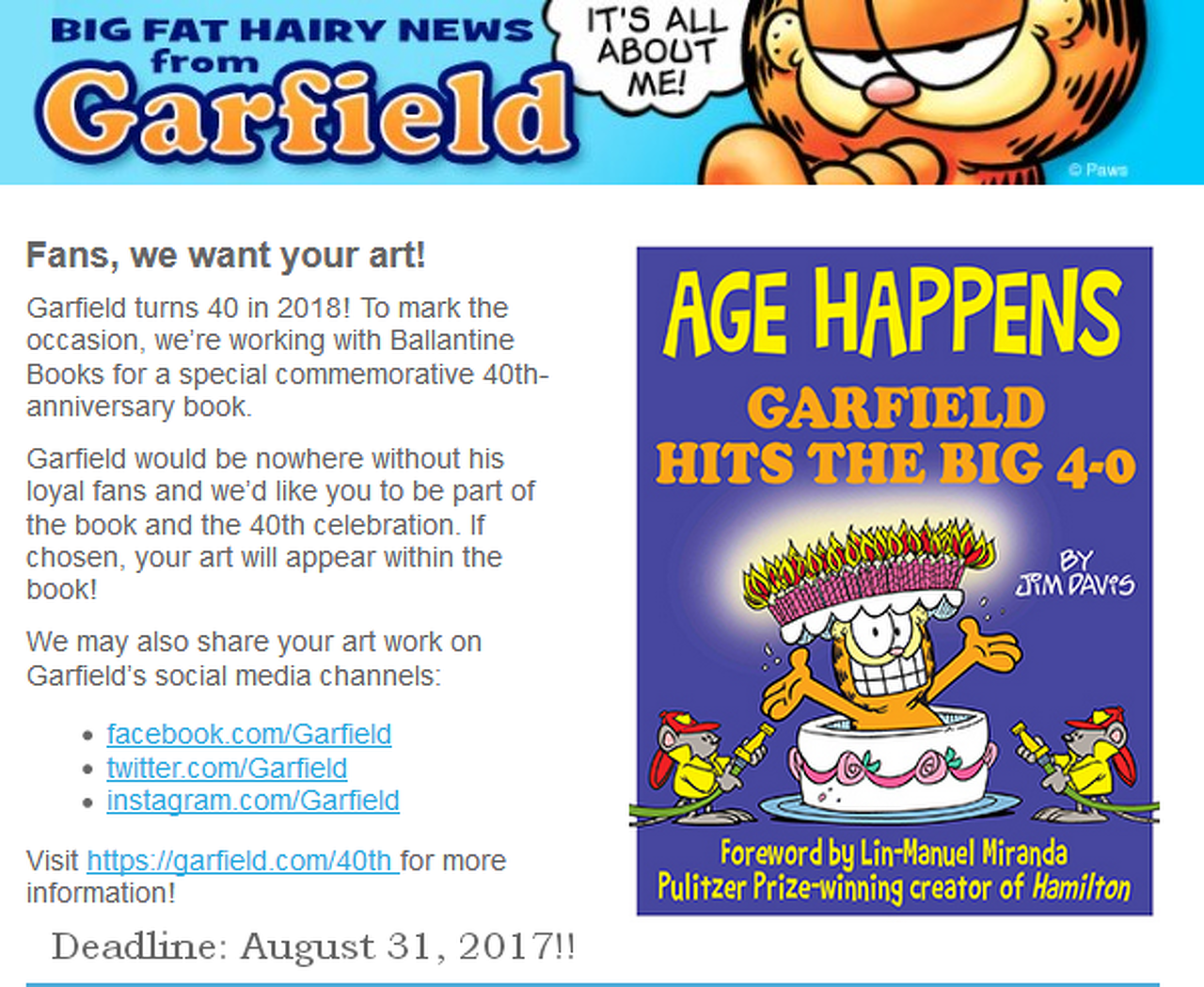 Garfield jövőre 40 éves lesz, ennek alkalmából várják a rajongók rajzait is, amit ha kiválasztanak, akkor majd a közösségi oldalaikra meg a könyvbe is bekerül!! Aki kedvet érez, az bátran alkosson, mert augusztus 31 a határidő!!