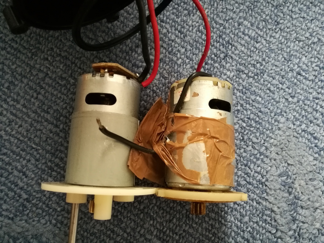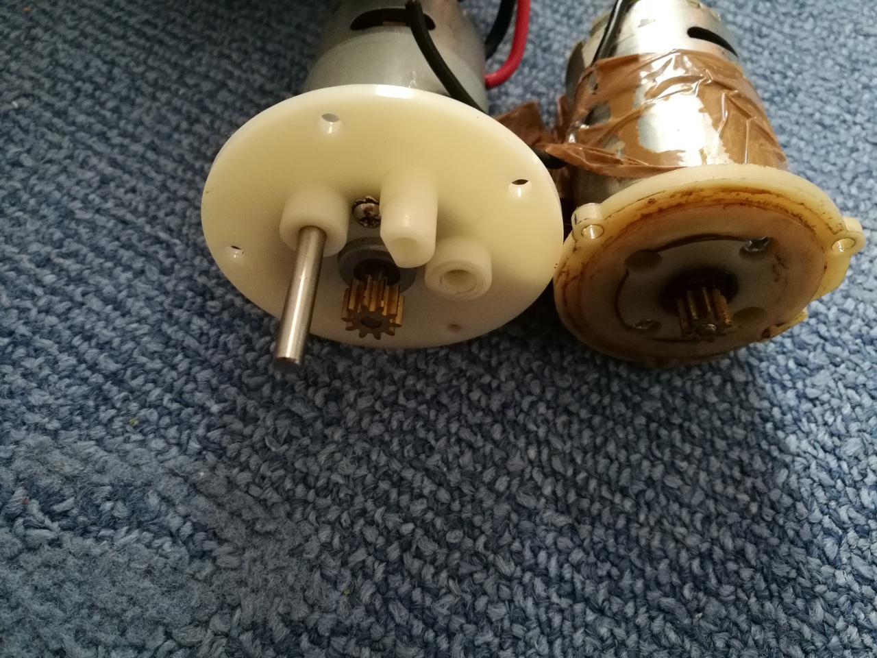 Sikerült szereznem egy 14.4V-os Csavar behajtó motort. Szétkaptam újra a Jetski-t mikor egymás mellé raktam őrültem. Meghajtottam az eredeti motort 12V-al,aztán a beszerzett motort 14V-al (lehetett hallani hogy az új jóval gyorsabban pörög). Arra gondoltam hogy ezt meghajtani kb 5 db sorba kötött 3,7V-os Li-Ion akkuval. A tengelyekről át kéne cserélni a fogaskereket (azzal szívok most úgy érzem).