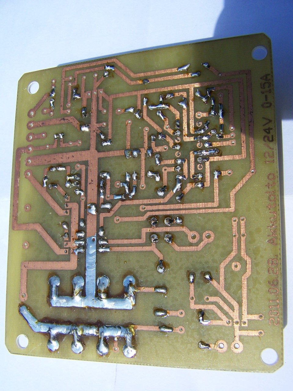 A lenti fekete kiöntött részben voltak a teljesítmény cuccok, szerencsére volt mivel kiváltani, 2 db sorosan kötött igen nagy autó-akksival tudtam tesztelni. A mérések, és a trafó hangján elég jók az eredmények. Akinek nem inge, ne vegye magára! Tudni kell, hogy itt a trafó feszültsége nagyobb, mint az adott akkumulátorhoz szükséges. A "normál" akksi töltőt, úgy mértezik, hogy a töltés végén elérje a cellánkénti 2,56V-ot, 15,6 V, illetve 31,2 V a töltési feszültség vége. Ez természetesen csak, " nyitott" vagyis víz utánpótlás szükséges akkumulátorok esetén egészséges. A gondozásmentes, vagyis nem felbontható, csak robbantható akksik esetén ez 14,4 V max. Ezekbe van egy "pára-visszanyerő" labirintus rendszer, de fölé menni akkor sem érdemes. Intenzív buborékolás kezdődik meg ilyenkor, ami víz-vesztességgel jár, viszont beindul az akkumulátorban az equalization funkció, vagyis, ilyenkor jó akksi esetén leesik 1-2 A re az áramfelvétel, s a cellák azonos szintre kerülnek. A tirisztorok a nagyobb váltó feszből fázishasítás révén állítják elő a töltéshez szükséges feszültséget, ami impulzus jellegű, és igen jót tesz a szulfátosodás ellen. A soros shunt 4 A körül mutatott, míg szkóppal 40A körüli impulzusokat tudtam mérni rajta. Ezek nagyban segítenek a nem nagyon megkeményedett szulfátréteg visszaépülését a lemezekbe.