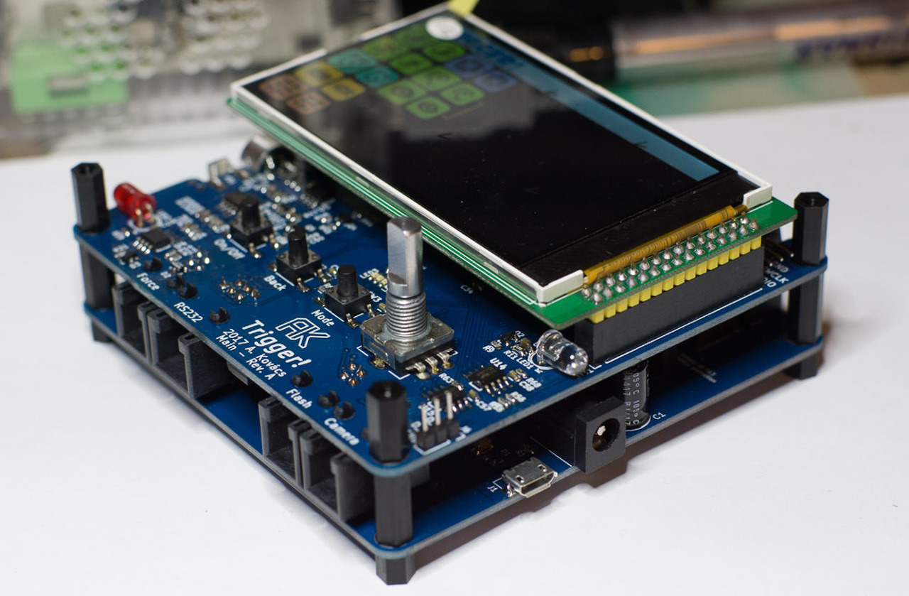 Ez a kütyü a fényképezőgépem automatikus vezérlését fogja majd lehetővé tenni. Van rajta mozgásérzékelő, fényérzékelő, mikrofon, illetve erőhatások érzékelésére képes szenzor is köthető rá. Ezenkívül van még rajt infravörös ki és bemenet is. A felhasználó 3 nyomógombbal, illetve egy szintén lenyomható forgókapcsolóval (enkóderes) kezelheti majd az eszközt. Képes lesz a tervek szerint mind a kamerát, mind egy vagy két külső vakut is működtetni, illetve későbbi bővíthetőség miatt terveztem rá egy standard RS232 portot is. A most még nem beforrasztott bluetooth modulon keresztül pedig később telefonon keresztül is vezérelhető lesz (a nagyon távoli jövő). Az ikonokat egy külső SPI flash IC-n tárolom majd, a beállítások pedig egy I2C-s EEPROM-on lesznek. A tápellátása lehetséges 12V-os adapterről, 5V USB-ről (pl. powerbank), illetve beépítésre került még egy Li-ion akku a töltő és védőelektronikával együtt.