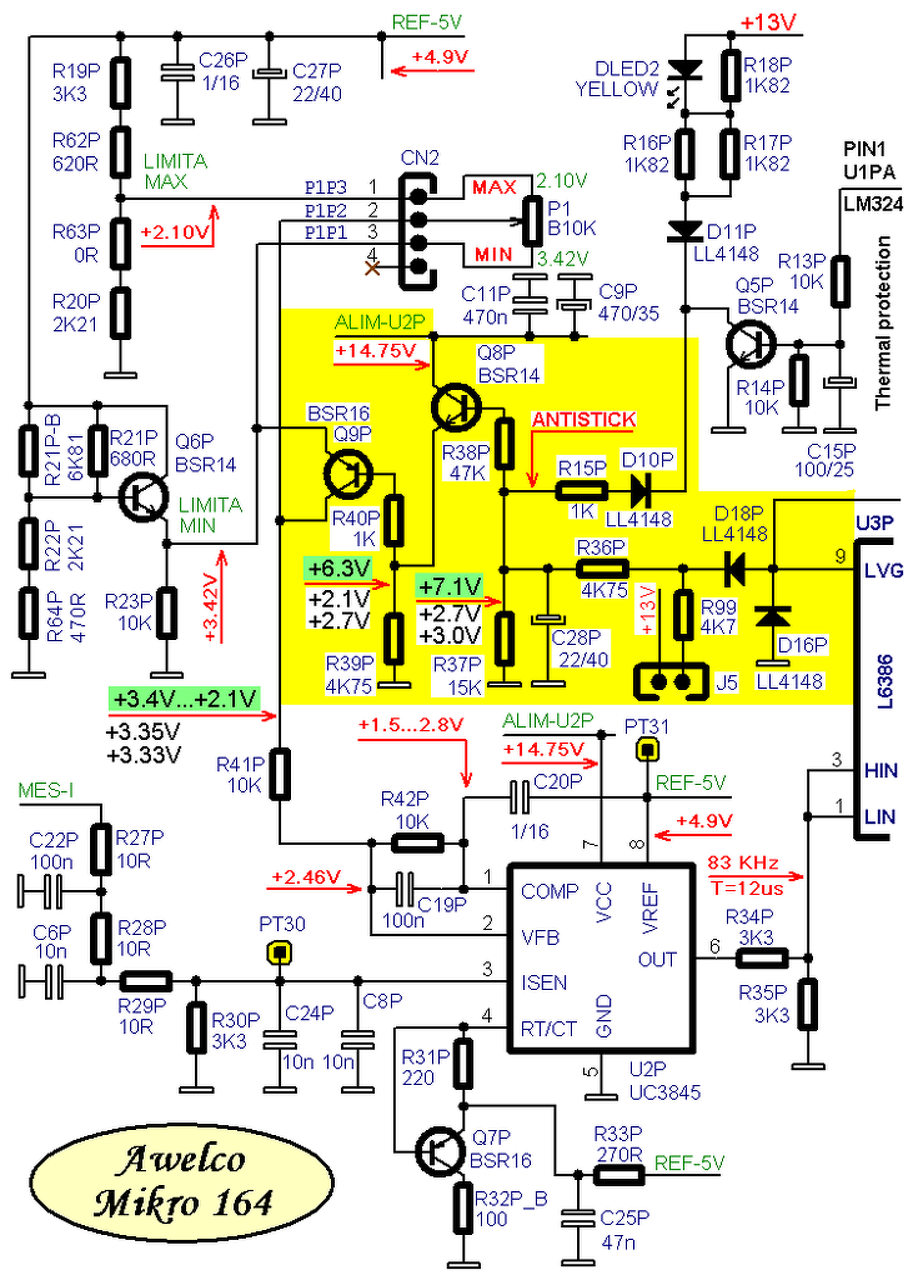 Van itt nálam egy Güde 160-as gép ami hasonlít az Awelco mikro 160-as gépre. Cserélve lett: felső és alsó IGBT-k, áram figyelő ellenállások, UC3845, L6386, LM324, zener diódák, stb. A kimeneti diódák rendben vannak. Nem sok minden maradt eredeti. Minden feszültség rendben, a vezérlés is jónak tűnik. A szkópommal( C1-94) csak azt látom hogy a négyszög jel megvan egészen az IGBT-k lábáig. A gép rendesen bekapcsol zöld LED világít, venti megy, 72V a kimeneten, sárga LED elalszik, relé kattan, viszont tilt az anti stick. Q8P bázis ellenállása előtt a 7,1V helyett 2,7V-ot mérek. Azt vettem észre mérés közben, hogy ha a potit majdnem max.-ig tekerem akkor a 2,7V elkezd emelkedni és 7V környékén nem tilt az anti stick. Az áram figyelő körben lévő alkatrészeket rendben találom. Hogyan érzékeli ez a gép a pálca leragadást? Találkozott már valaki ilyen hibával? Üdv.