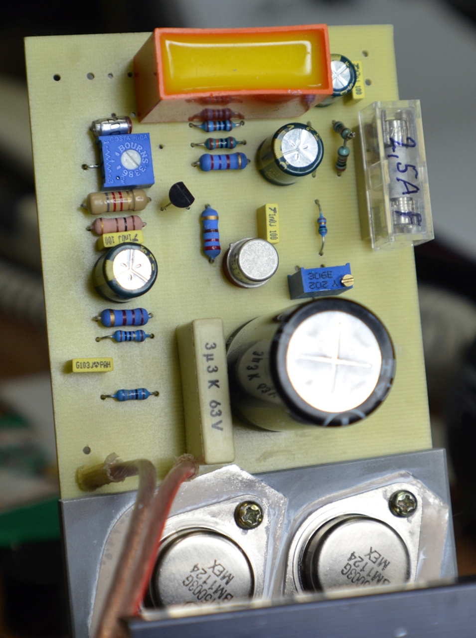 Itt egy kicsit más tranyókkal, jobbnak reméltekkel építkeztem. Valamelyik téli napon bedobozolom, nagyobb hűtővel, ez kicsit karcsú. A táp, a nyugalmi áram hozzá 4-6 Ohm terheléshez van beállítva.