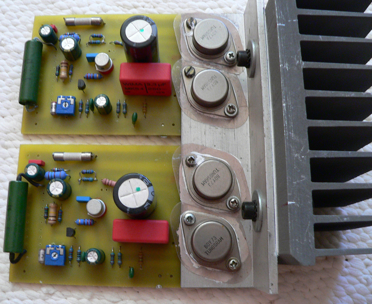 Itt egy kicsit más tranyókkal, jobbnak reméltekkel építkeztem. Valamelyik téli napon bedobozolom, nagyobb hűtővel, ez kicsit karcsú. A táp, a nyugalmi áram hozzá 4-6 Ohm terheléshez van beállítva.