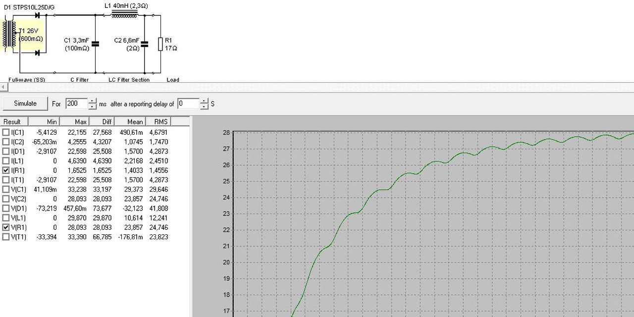 Ráadásul rábukkantam egy félretett 230VA toroidra, 4x13V szekunderekkel, vagyis mindkét oldal önálló szekundereket kaphat, a szimuláció is egy oldalra készült.
