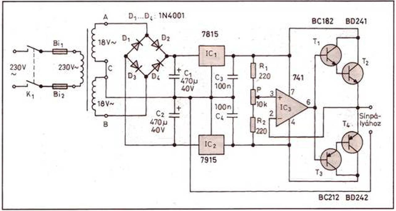 Egy kis segítséget kérnék mielőtt megőrülök. Megépítettem a lentebbi kapcsolást (annyi módosítással, hogy a BD241/242 helyett BD243/244-et, a BC182/212 helyett pedig BC337/327-et használtam. Ohmikus terheléssel (16 ohm) teljesen jól működik, a pozitív és negatív tartományban is. Viszont ha rákötök egy kis DC motort akkor csak a negatív tartományban hajlandó működni, hiába tekerem a potit a másik végállásba a feszültség nulla marad.