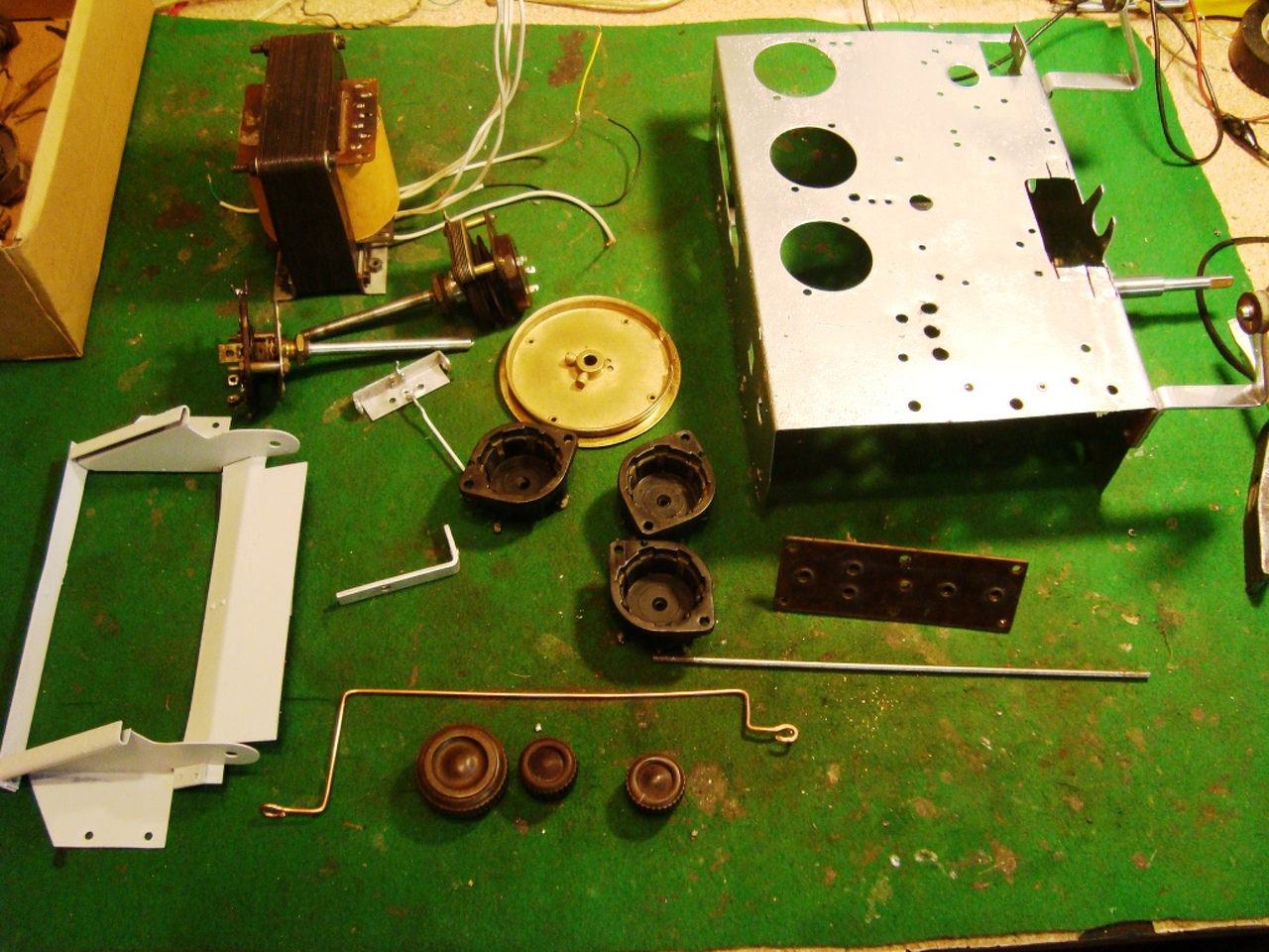 Folytatom a Sandardot. Ma egész nap ezzel foglalkoztam kb 8 órát. Teljesen lebontottam a panelt, meg az összes alkatrészt. Amit lehetett rozsdaoldóztam, lefestettem, lefújtam. Annyi alkatrész használható, ami a képen van, a többit pótolni, gyártani kell. Volt egy félig kész trafóm, azt is összeraktam a géphez igazítva a feszültségeket. Most minden szárad. Holnaptól egy hétig nem leszek itthon, ha haza jöttem folytatom a felújítást. Üdv.
