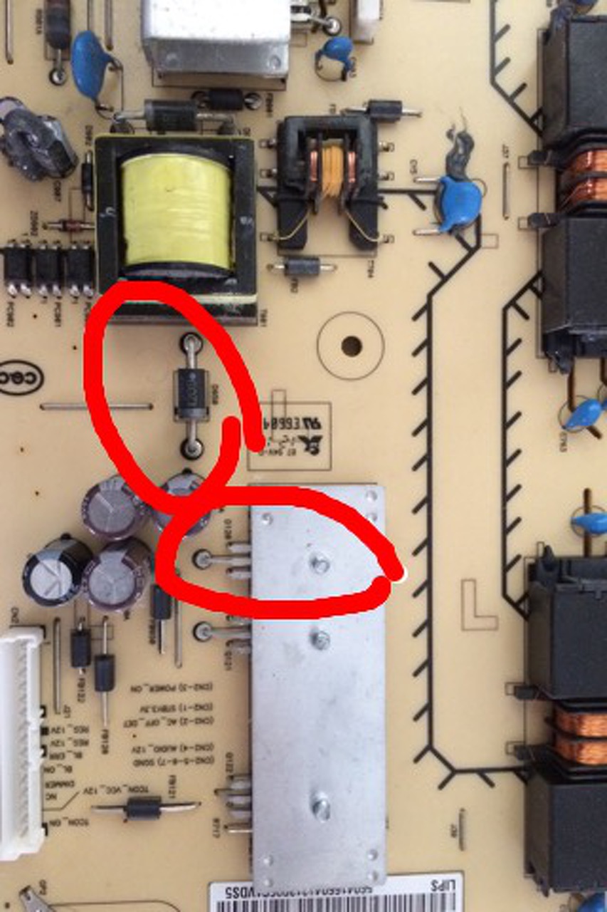 Kaptam egy hibás Sony TV-t, KDL-40BX450. A tulaj azt mondta, hogy pukkant egy nagyot és többé nem kapcsolt be. Standby LED sem világít. Szétszedve látható hiba nincs a nyákon, se egy megpörkölődött ellenállás, se egy kidurrant kondenzátor. Mivel erősen kezdő hobbiszerelő vagyok, így a neten fellelhető infók alapján indultam el, de elég hamar elakadtam. 240V-ot kimértem a nyák csatlakozóján, tehát a kábel jó. Biztosíték szintén megvizsgálva, szakadásmentes. Nagy kondinál megvan a DC 330V. Megmértem a Standby csatlakozónál, hogy megvan-e a 3.3V, de azt már nem találtam. És itt el is akadtam. A képen bekarikázott diódák gyanúsak, a nagy mindkét irányban vezet, bár az ellenállása jelentősen megnő a "rossz" irány felé. A 3 lábú szintén nem mutat szakadást egyik pár lábon mérve sem. De félek nincs elég szakértelmem, hogy bármit is rossznak kiáltsak ki. Van valakinek valami ötlete, hogy hogyan tudom feléleszteni ezt a TV-t? Szívesen elvinném szakihoz, de másik kontinensről nem olyan egyszerű hazacipelni, itt meg a "vegyél újat" elv miatt már rég kihaltak a tv szerelők.