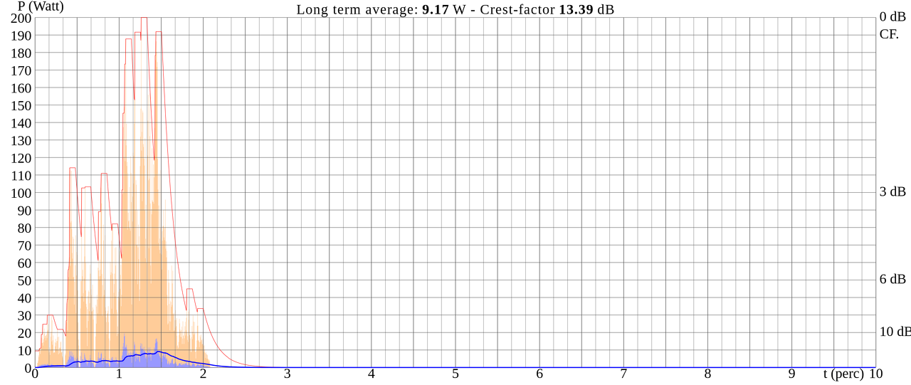 Jó, hogy meg lett említve a Himnusz és a Szózat, gyorsan le is mértem őket. Előbbi legrosszabb Crest-faktora tau=10s PT1 szűrővel átlagolval 13,39dB (9,17W egy 100W-os végfokról). Ha nagyobb, pl. 30s időállandóval átlagolnám, akkor ennek kb a 60-70% lenne és kb 15dB a CF. A Szózat CF=13,68dB Pátlag=8,57W legrosszabb értéket hoz 10s átlagolás mellett. Hangszóróban egyrészt azért fog kevesebb hőt fűteni, mert a lengőnek inkább 30s körüli az időállandója, másrészt meg azért, mert a hangszóró átlagimpedanciája nagyobb, mint a névleges, plusz még azért, mert reaktív terhelést valósít meg, az energia egy részét elfűti ill. hasznosítja, egy részét pedig visszatáplálja a végfok felé. Maradjunk annyiban, hogy ezek a számok kb elharmadolhatók, 3-3,5W hőenergiát fog a lengő elfűteni. A zenei művek crest-faktora nagyon széles skálán nézve mindig 10-20dB között vannak. Egyszerűen azért, mert ha 10dB-nél kisebb, akkor nagyon komprimált, tömör, nem szól szépen, ha 20dB-nél nagyobb, akkor pedig nagyon levegős, nagy dinamikaugrásokkal, bár pl. komolyzenei művekre sokesetben ez utóbbi érvényes. Feltételezen, hogy a fenti két nemzeti művünknek már egy kompresszált verzióját töltöttem le az Oktatási Hivatal oldaláról, évnyitón ünnepségek alkalmával nem jó a túl nagy dinamikatartományú változata, nem hallják jól az embrek a halkabb szakaszait.