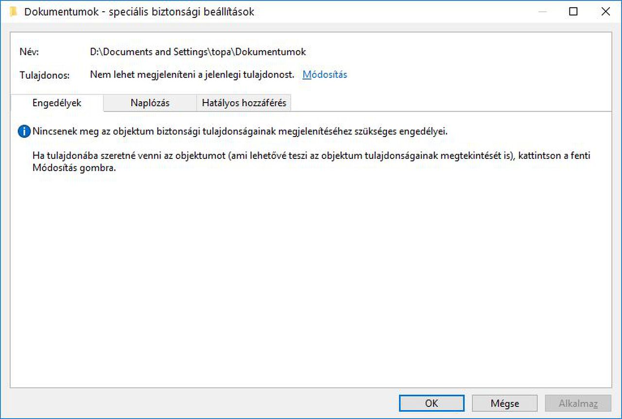 Éppen ez az. Azt írja a W10, hogy nincs tulajdonosa, de semmilyen módon nem tudok jogot szerezni még a jogok átállításához sem mint rendszergazda és mint eredeti tulajdonos sem, holott még a név és jelszó is ugyanarra lett állítva. Minden elérhető víruskeresővel és kártevőirtóval végigvizsgáltam. Egyébként egy külső harddisken lévő Dokumentumok mappáról van szó.
