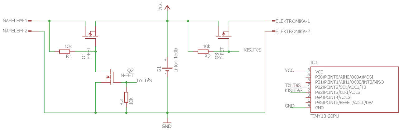 Egy akku túltöltését és túlmerítését szeretném elkerülni a töltés és a terhelés lekapcsolásával. Mellékeltem egy rajzot, hogy képzelem el. A három FET-el ez így működhetne? Az AVR folyamatosan az akkun lenne alvó módban, így csak pár-tíz uA-t fogyasztana. A reset láb fel lesz húzva és lesz feszültségmérés is, de ez most nem lényeg.