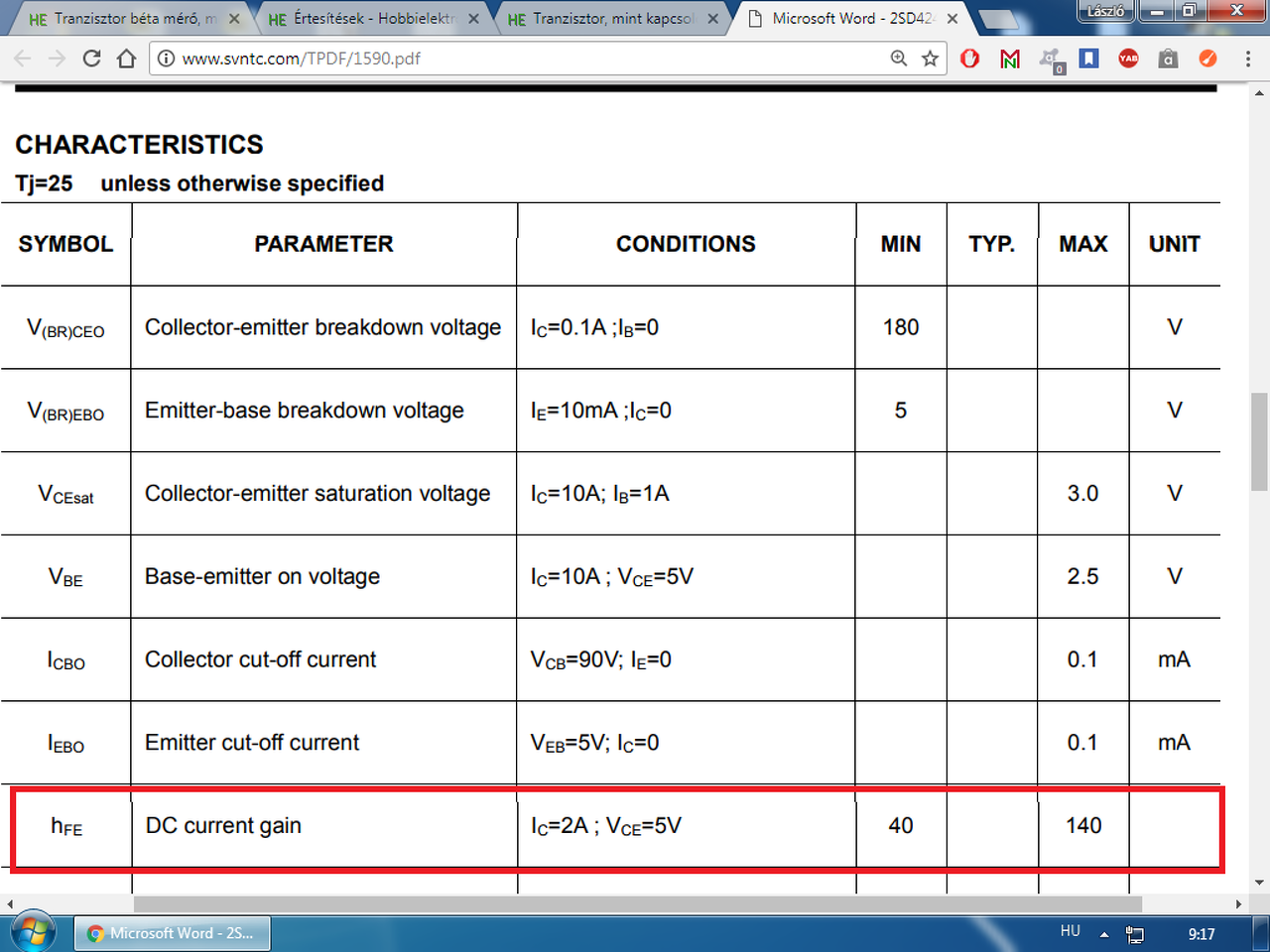 Itt van a tranzisztor hfe értéke,legalsó táblázat: