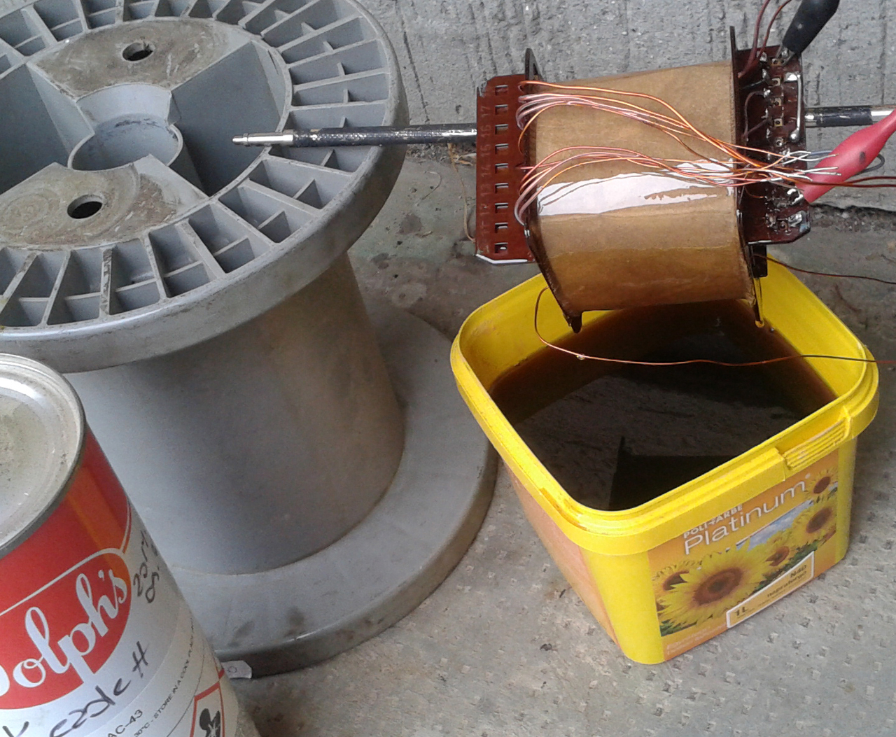 Most egy 180VA-es trafó látható, primer 0.5mm-es és az egyik szekunder szintén ilyen vastag huzalból lett tekerve. Tápegységről adok neki annyi feszültséget, hogy kb. 1.6A folyjon a tekercseken, ettől jó melege lesz. Eztán lakkba mártom, onnan is kivettem, majd újra ráadom a villanyt, amitől ca. 50-60 Celsiuson gusztusosan kisül, keményedik néhány óra alatt. Azért ennyi idő alatt, mert van időm. Lehetne több is a hőfok, ennyit tud a táp.