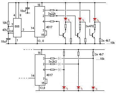 A 6 tranzisztoros szinte biztosan azt csinálja amit kérsz.Azon gondolkodtam valami kerékpár villogó ,ami eleve futófénnyel jön be,vagy az első variációja a futófény (ekkor a bekapcsológombra kell egy kondi) meg lehetne próbálni .A ledeket a kedvenc szineidre kicserélni, és szerintem elviseli a párhuzamos ellenállásokat az IC vel.