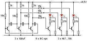 Sziasztok! Én egy olyan olcsó, kicsi, és egyszerű kapcsolást szeretnék, amivel meg tudom csinálni azt, hogy 3 LED-et villogtatok folyamatosan úgy, hogy a másik 2 is világít közben halványan. A lényeg az lenne, hogy folyamatosan a következő villanjon fel: 1-2-3-1-2-3-1