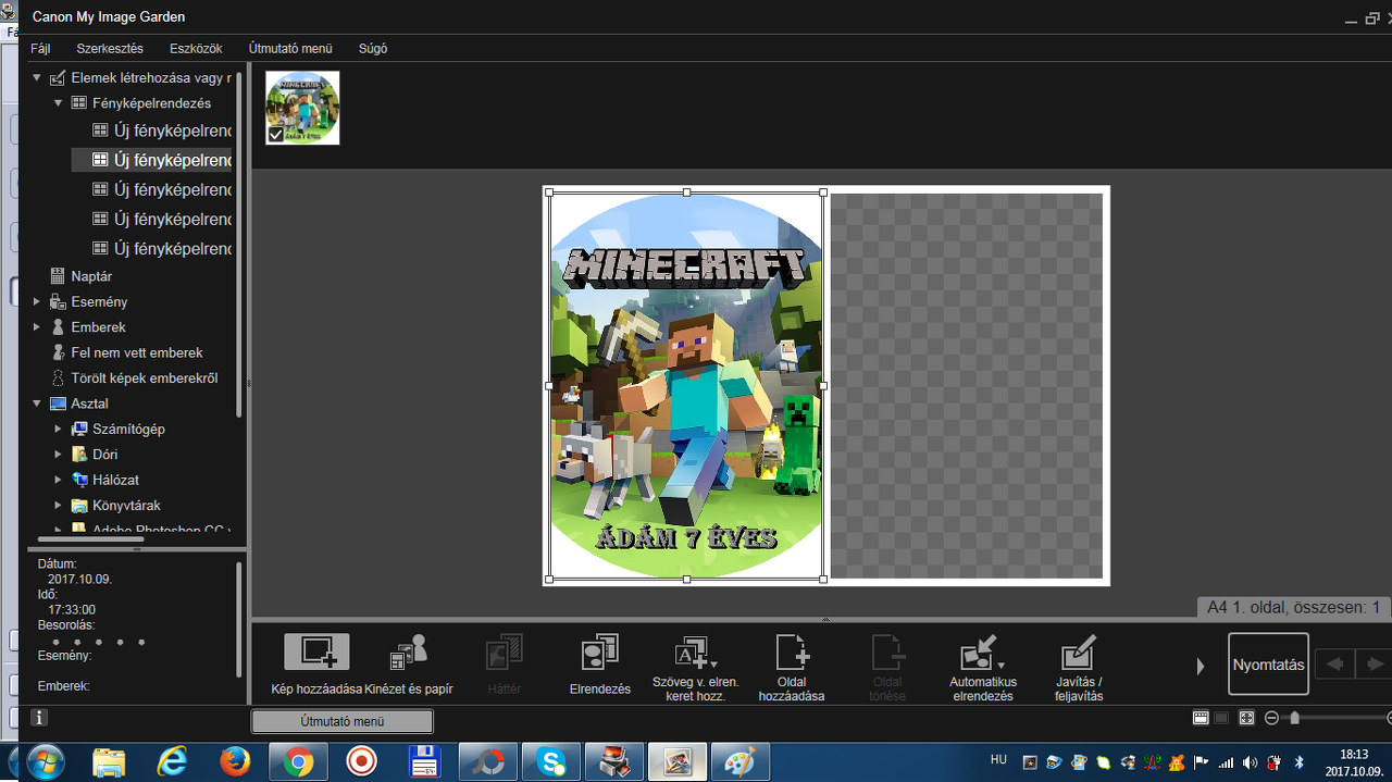 Most rendeltem egy új nyomtatót, Canon TS5050. Problémám az lenne, hogy egyszerűen nem tudok A5 méretet nyomtatni vele. Tehát A4 lapra kellene egy darab A5 kép... Akár hogy próbálom, nem megy... Ez az új program ultra átláthatatlan... Canon My Image Garden-ben próbálkozom... A régi nyomtatómhoz Canon Easy Photoprint EX programot használtam, baromi egyszerű volt. De ez az új... Képen megmutatom mire gondolok. Az egyik képen a régi programmal látható, hogy egészben meghagyja a kört, beállítottam, hogy kettőt nyomtasson egy A4 lapra, szegéllyel, lapra igazítja, kész mehet nyomtatni... Az újjal pedig levágja a két szélét... És akárhogy próbálkozom, igazítom, forgatom, nem bírok vele. Fénykép elrendezésnél rákattintok, hogy 2 kép legyen egy lapon, szegéllyel (hogy ne érjen lap széléig teljesen), beállítok A4 papírméretet (A5 nincs is a beállítások közt...) és beillesztem a képet. Ha rákattintok, hogy "igazítás, vagy elosztás", van egy pipa az "igazítás az oldalhoz" menüben, de nem tudom ezt kiiktatni, lehet ez a baja. Állandóan lecsapja. Megőrülök már... Valaki segítsen please... Köszönöm!